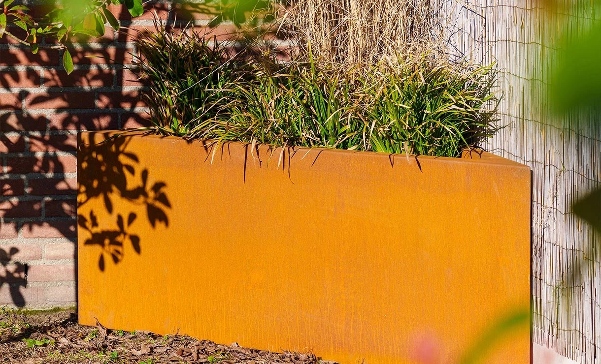 De strakke vormen en warme uitstraling van het cortenstaal geeft deze cortenstalen plantenbak uw tuin een stijlvolle en karakteristieke touch. Het cortenstaal, ook bekend als weervast staal, draagt bij aan de warmte van de bak. Door de natuurlijke roestlaag krijgt het cortenstaal zijn kenmerkende oranjebruine kleur, wat het geheel een prachtige uitstraling geeft. Bovendien zorgen weersomstandigheden ervoor dat het cortenstaal nog mooier wordt na verloop van tijd.