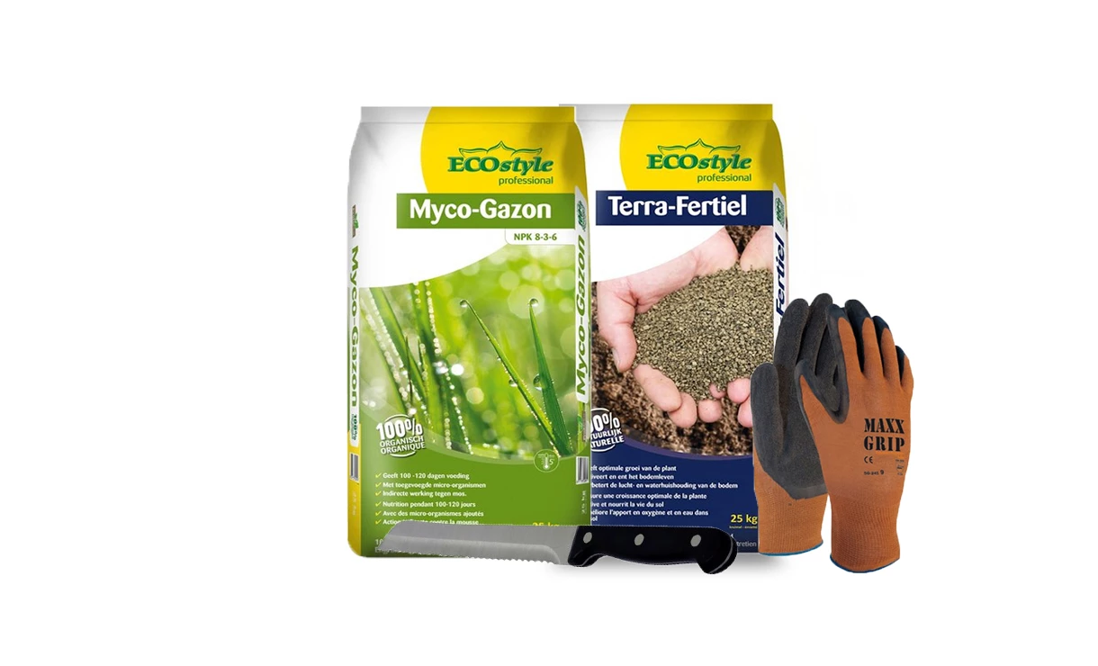 Gazon startpakket XL geeft de graszoden exact wat deze nodig hebben. U strooit beide verpakkingen met meststoffen uit op de geëgaliseerde ondergrond. Daarna rolt u de graszoden uit en snijd deze eenvoudig op maat met het graszoden mes.